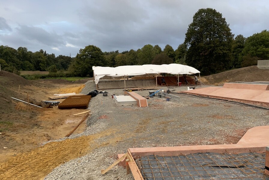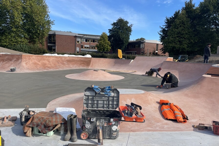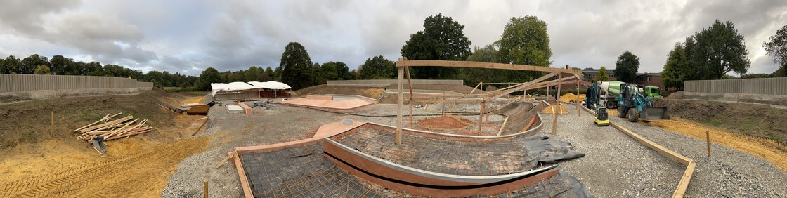 Ab 23.07.2025 starten die Modellierungsarbeiten mit Erdreich - ein Wall wird aufgeschüttet, der auch dem Lärmschutz dient. Schotter als untere Schicht für Wege und die Skatefläche wird eingebracht und verdichtet. Die reine Skatefläche aus Ortbeton wird eine Größe von 820 m² haben, die Zuwegungen werden mit ca. 230 m² Pflaster gestaltet.