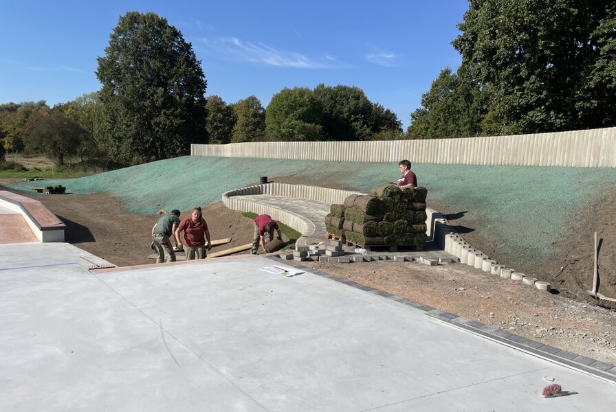 Im Bereich der Skatebahn werden auch die Außenflächen gestaltet: Rasenflächen werden zum Teil mit Rollrasen angelegt und die Pflasterflächen im Aufenthaltsbereich und der Zuwegung gestaltet.